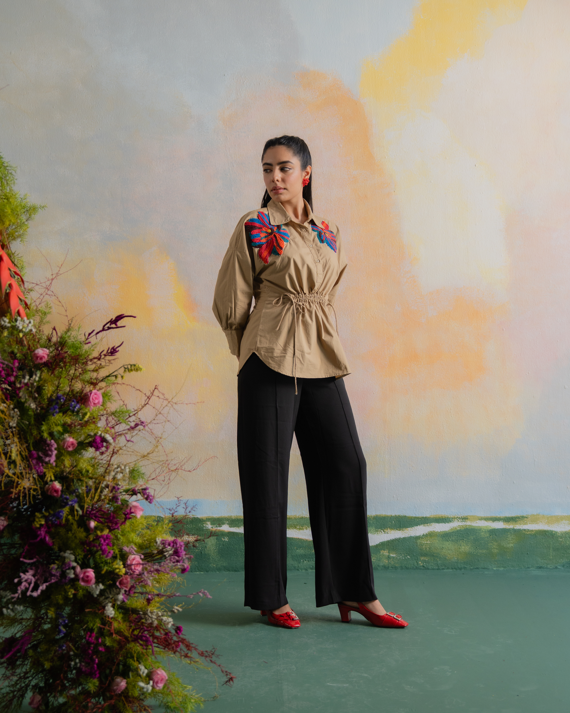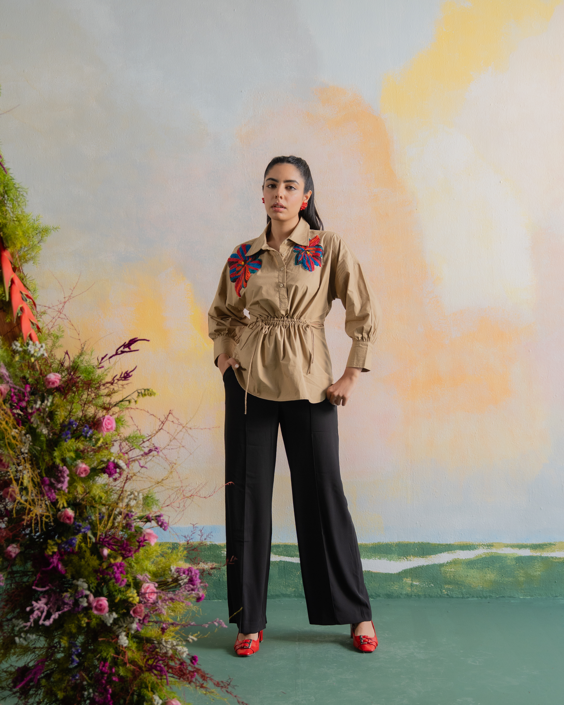 Crafted in a warm sand hue, this shirt is adorned with vivid floral embroidery in rich reds and blues. The gathered waist creates a flattering silhouette, making it a standout choice for those who embrace bold beauty with grounded grace.
