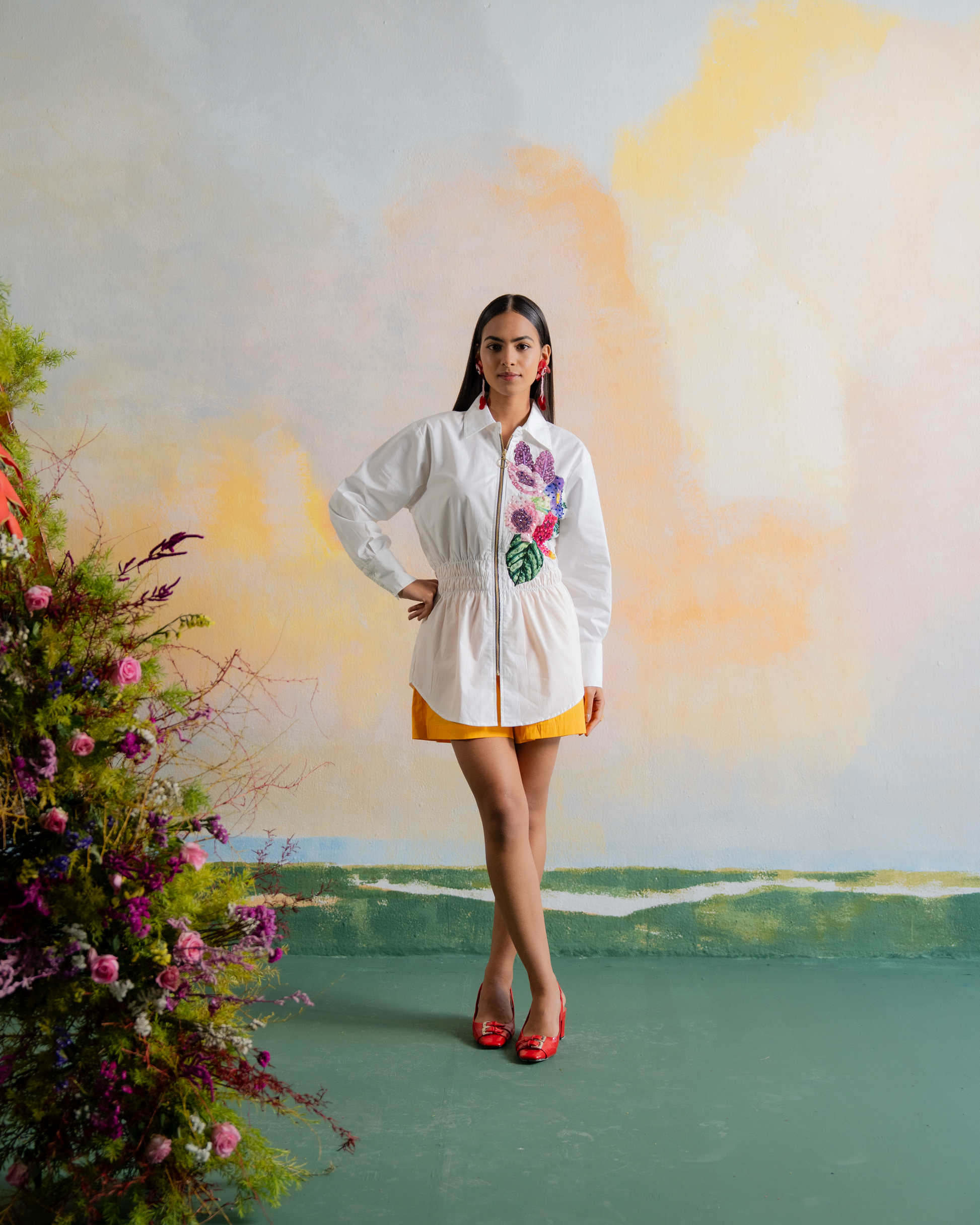The Enchanted Forest Shirt is a crisp white essential brought to life with vibrant botanical embroidery. Featuring a flattering cinched waist and vivid floral detailing, this statement piece is bold, breezy, and effortlessly chic—perfect for days when your outfit does all the talking.