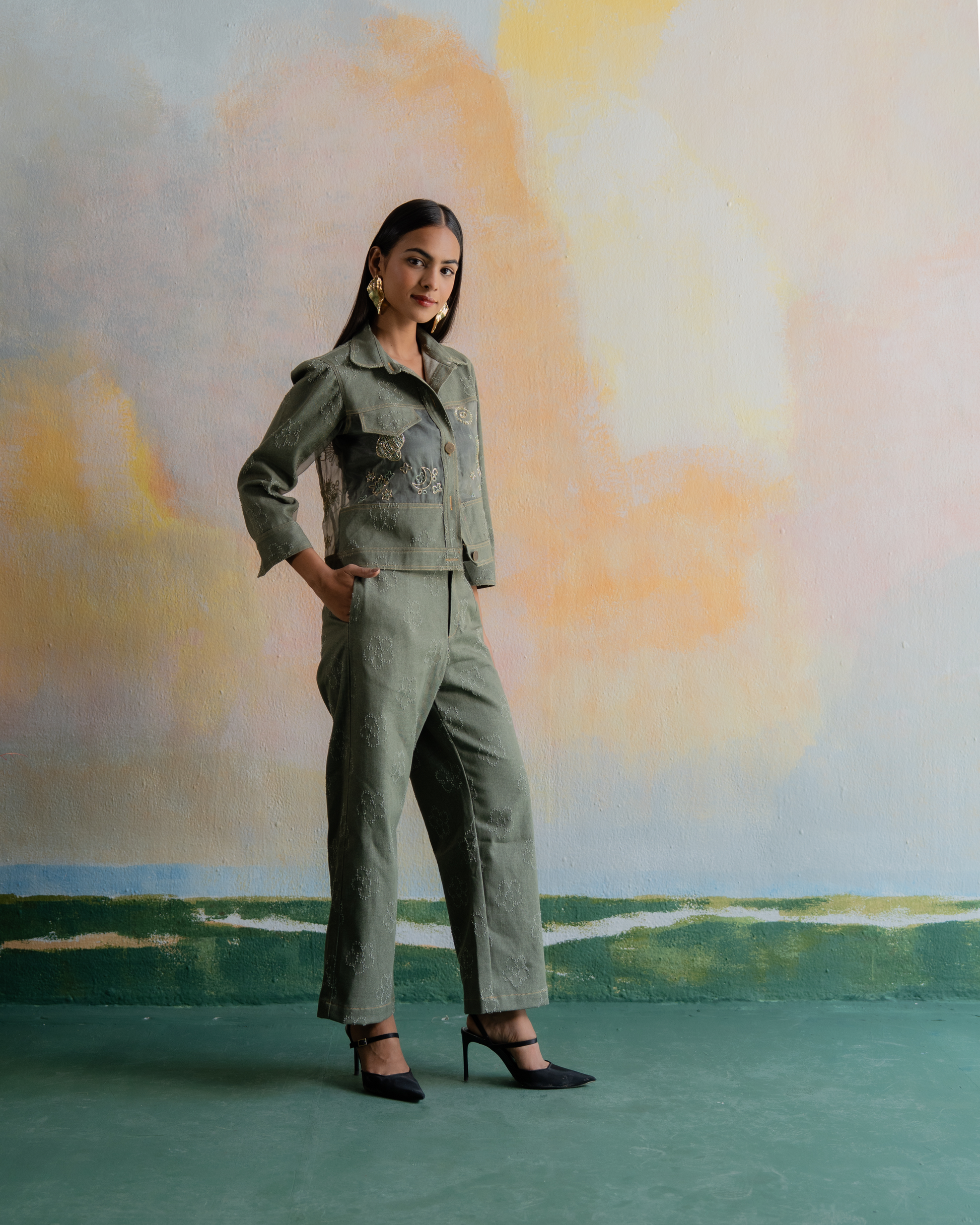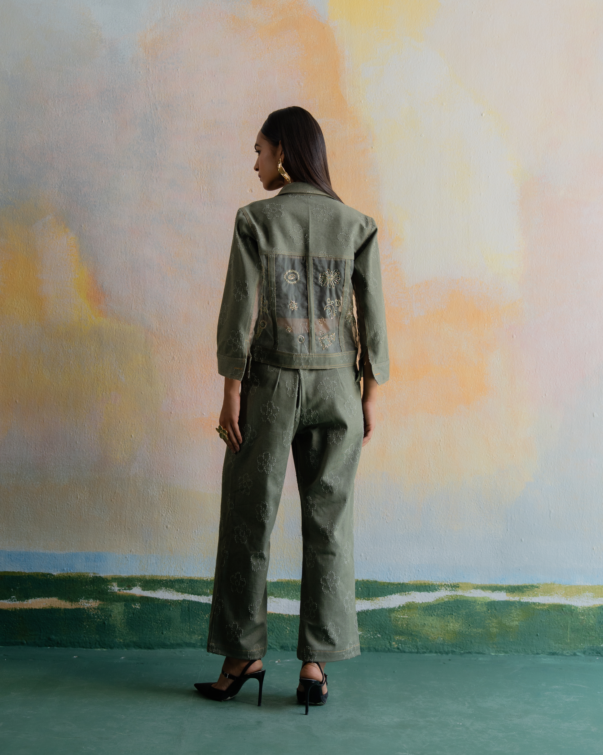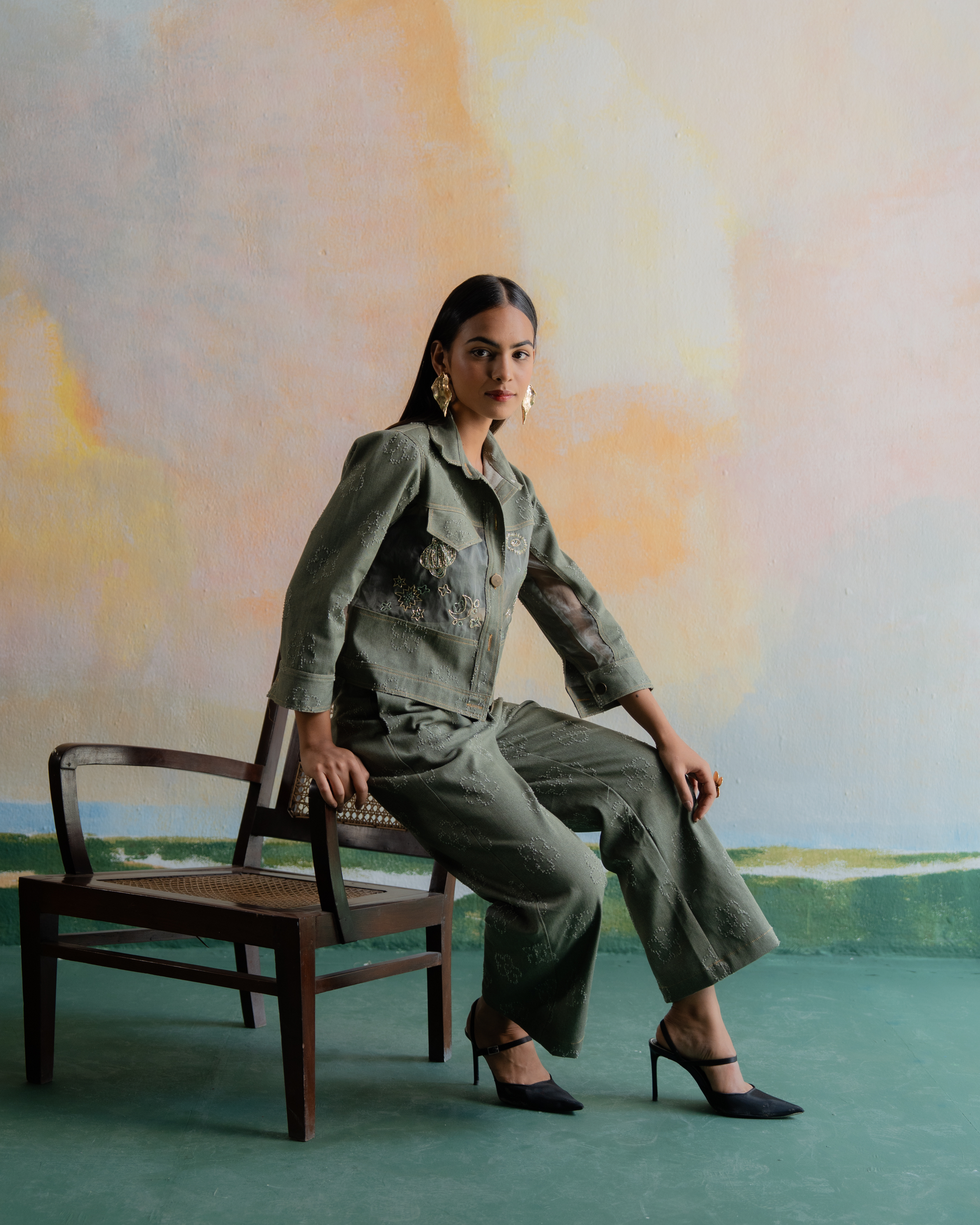 A celestial spin on classic denim, this olive co-ord is adorned with delicate embroidery and metallic accents that evoke starry skies while staying grounded in earthy tones. A cosmic blend of structure and soul.