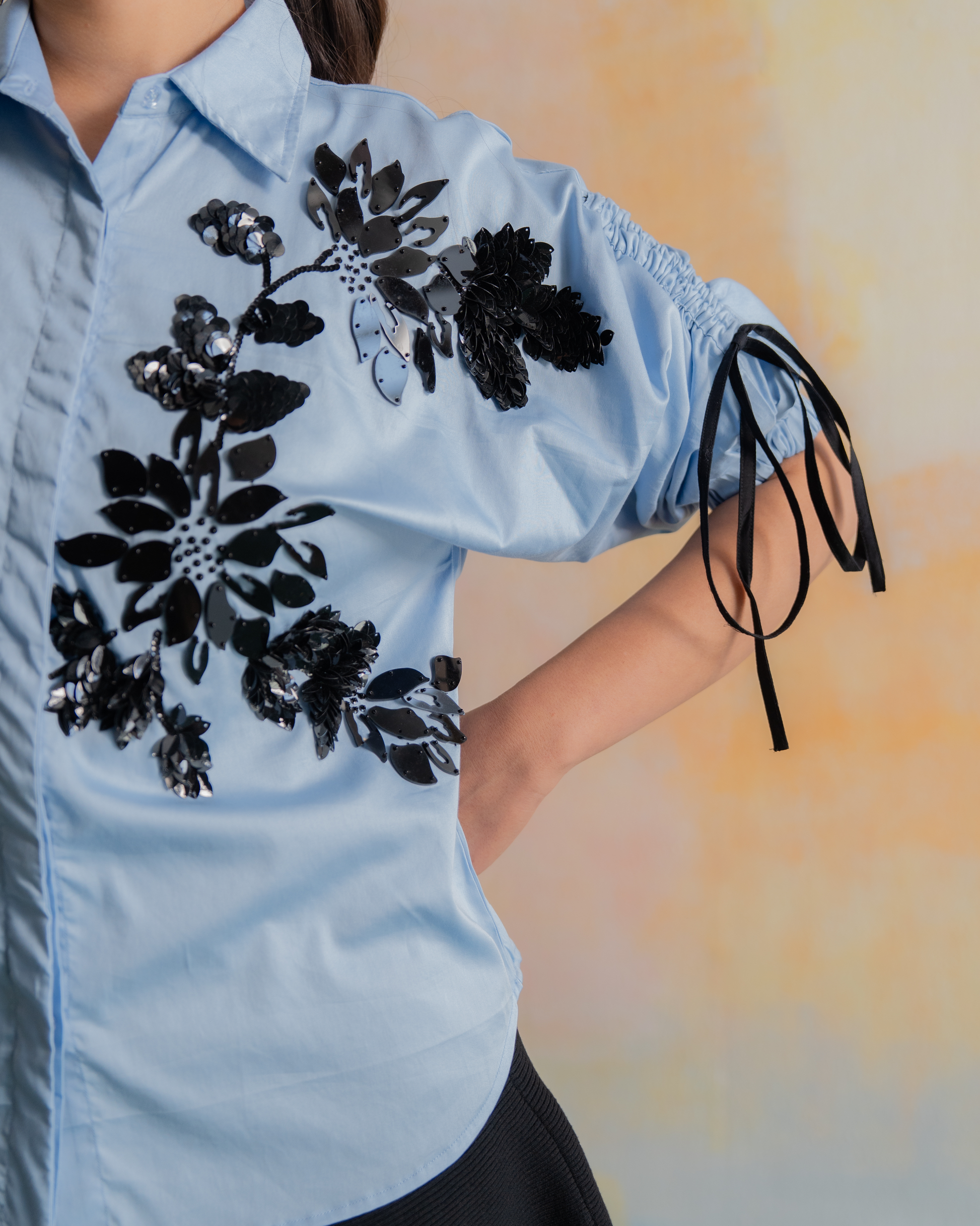 Make a bold statement in soft blue with the Ink Bloom Shirt. Featuring dramatic black floral embroidery and gathered sleeves with tie-up detailing, this breathable cotton piece perfectly balances edgy style with timeless elegance.