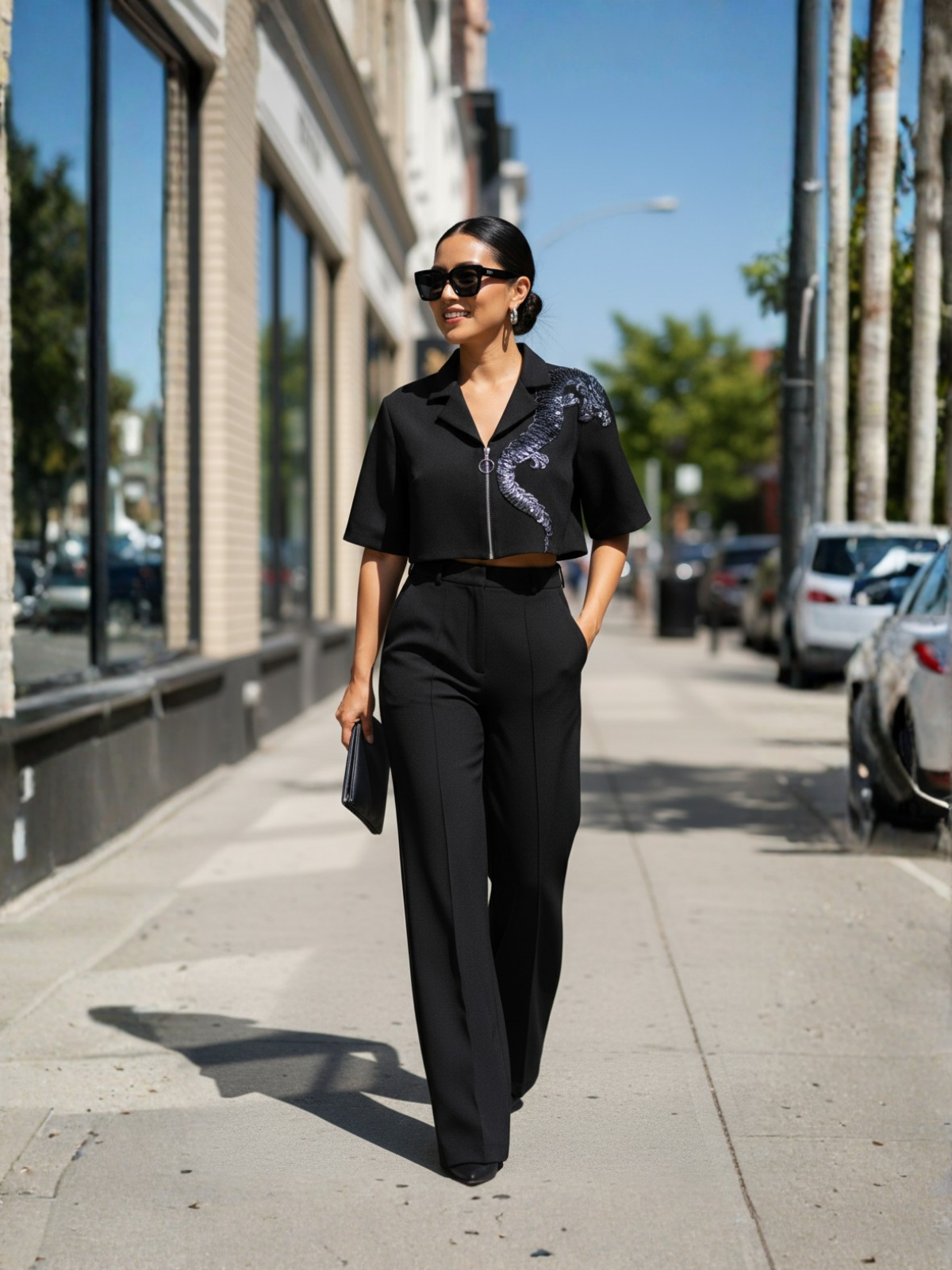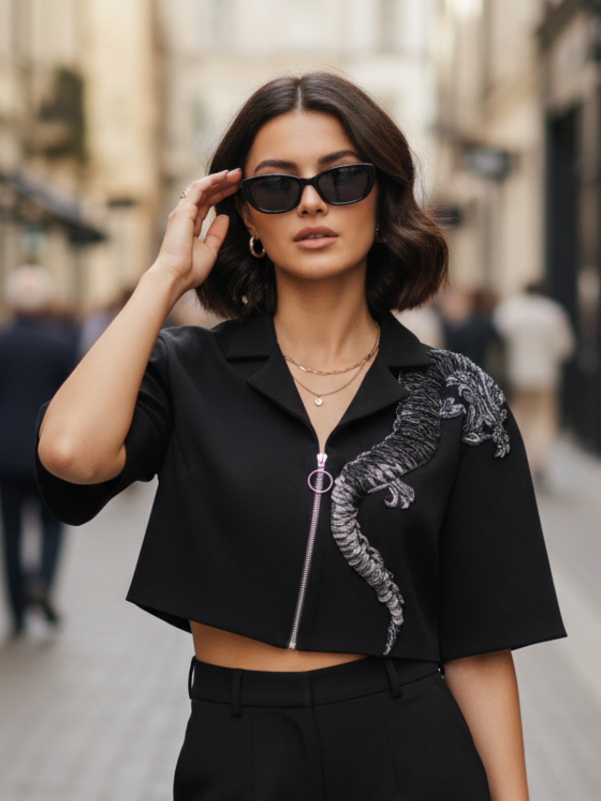 Make a bold statement with the Zipped Dragon Coord. Featuring an eye-catching embellished dragon design, this coordinated piece comes with a convenient zipper closure for easy styling. Paired with sleek bottoms to create a look that turns heads wherever you go.